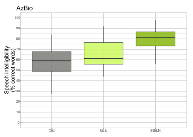 Figure 2: Speech understanding scores for all three conditions with 17 participants. Comfort in Noise (CiN) had an average performance of 58% (±15). Speech in Loud Noise (SiLN) had an average performance of 66% (±14). Spheric Speech in Loud Noise (SSiLN) has an average performance of 80 (±11).